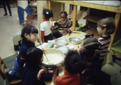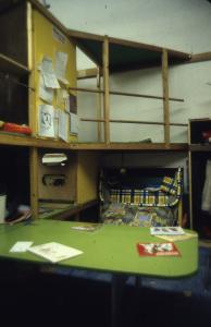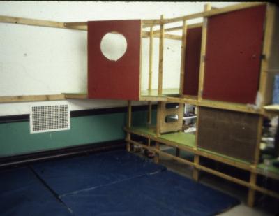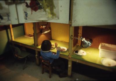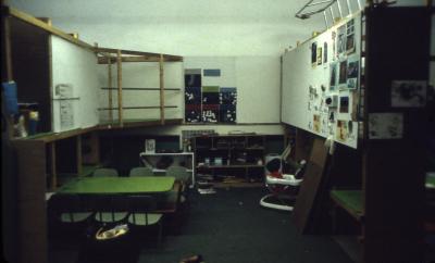 Here we solved it by dividing the large open space into small classroom with movable, wood frame, "thick walls". Using 2x3's and painted plywood, we built 3-D grids on wheels and made them stable by connecting them to ledger strips on the all walls with triangular shelf/lofts. The ledgers supported reversible panels for pin-up, chalkboard, pegboards and other storage units. Each classroom section had a few folding tables attached to the frames for eating and art. All the seats and equipment was stored in the frames, which were folded against the walls on weekends. Cheap, clip-on lighting was used so that the harsh fluorescent lights could be turned off during quiet times of the hectic day.