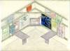 Michelangelo's Sistine Chapel ceiling is considered the most beautiful illustration of biblical events and characters ever created. It tells timeless stories and inspires awe but it has one major drawback - it's a pain in the neck to look at. Because a wall is perpendicular to both your line of sight and your reach, it, not the ceiling, is the building surface most often used to communicate information as well as the most often manipulated or used by hands. The extent to which walls are put to use in classrooms used to be measured by how deep a thumbtack pierced a bulletin board or how thick the chalk dust accumulated on a blackboard. Nowadays we hang an LED screen and use a white board but the rest of the wall space remains pretty much unchanged. Every September, teachers perform the yearly ritual of taping or tacking up construction paper decorations and posters only to take them down in June, leaving bits of torn tape on the walls for the janitors to peel off during the summer. That's why, from the very start of our design history, we developed two of the most important practical principles of making places for kids - LEDGER STRIPS and FRAMEWORKS. LEDGER STRIPS One way to make walls more useful is a simple system of horizontal wood boards attached to a classroom wall that we call Ledger Strips. They allow a teacher to attach things to the wall without having to tape, tack, drill or poke holes in it's surface. They can hold pin-up boards, chalk boards and posters, maps and charts mounted on masonite panels which can be displayed and removed as the class content changes. FRAMEWORKS Once the Ledger Strip is in place, the wall can easily support the growth of the classroom in the third dimension; folding tables, flexible storage units, overhead beams that support hanging stuff like globes, mobiles, clothes lines for displaying art and room dividers that extend into the space which, in turn, can support more stuff and activities. You are now creating a FRAMEWORK - a skeleton which allows the classroom to adapt to any purpose... ... which brings to mind a story that Gary used to explain the classroom design facts of life, and it goes like this... "Once upon a time, when the Earth was a bowl of primordial soup, the jelly blobby type animals ruled supreme. However, there was a problem. Because the jelly blobbies became so successful, they were able to eat so much that they would grow too large and fall apart under their own weight. Finding this a disadvantage, some jelly blobbies decided to make skeletons to hold themselves together. Immediately they were faced with another decision. They couldn't agree if their skeletons belonged on their outside or on their inside. So the soup being a democracy and the vote resulting in a tie, groups of each opinion went their separate ways. Now, a billion years later, the jelly blobbies that chose skeletons on the outside have turned into cockroach and crab types, while the inside guys have turned into us. It seems that deciding to put a skeleton around you was a bad idea and it slowed down the jelly blobbies' development. But having an inside skeleton or a FRAMEWORK instead made for more efficient growth and adaptation, therefore quicker change or "evolution"." Most classrooms already have you boxed in with an outside skeleton from the start. But if you're in a hurry to have your place evolve into a higher form of life, you can overcome some of the limitations of your classroom by providing it with a FRAMEWORK.